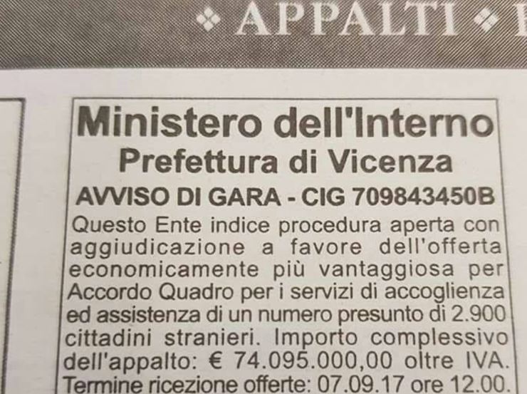 Dopo essere stato ampiamente annunciato è stato infine pubblicato il maxi bando per l’accoglienza di 2900 migranti nei prossimi due anni nel vicentino. 74 milioni e 95mila euro il valore complessivo. Cifra che ha fatto sdegnare i sindaci di Schio, Valter Orsi, e Isola Vicentina, Francesco Enrico Gonzo. “Soldi che finiranno nelle tasche delle cooperative. Basta prima che sia troppo tardi”.