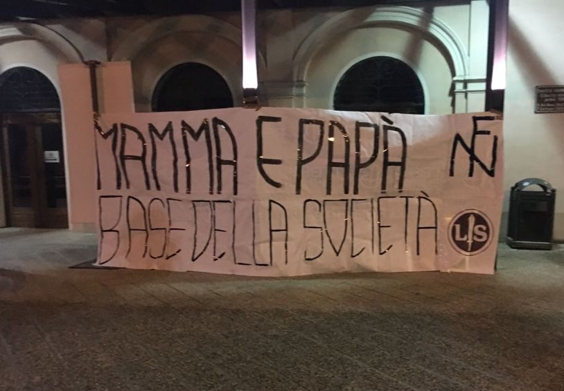 Gli attivisti di estrema destra hanno issato all’esterno del teatro nella notte di domenica uno striscione con la scritta “Mamma e papà: la base della società”.