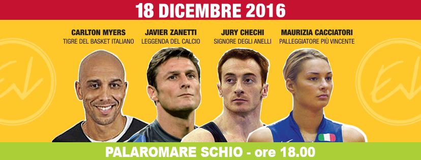 A dare l’annuncio del sold out sono gli stessi organizzatori, con un Pala Romare tutto esaurito per quello che si annuncia essere appuntamento veramente singolare e di livello. Un talk show frizzante con tre grandissimi atleti azzurri che hanno fatto la storia dei relativi sport come Juri Chechi, campione olimpico ad Atlanta 1996 nella ginnastica artistica; Carlton Myers, azzurro della pallacanestro, olimpionico con la rappresentativa italiana; Maurizia Cacciatori, palleggiatrice più vincente di sempre nella storia della pallavolo nazionale, e infine Javier Zanetti, indimenticato capitano dell’Inter, giocatore più vincente e presente di sempre con la maglia nerazzurra.