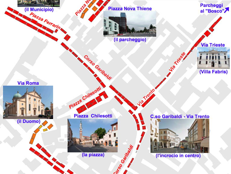 Il nuovo mercato si estende tra piazza Ferrarin, la zona traffico limitato, via Trieste, all’altezza di Villa Fabris, piazza Scalcerle, via Roma, davanti al duomo, comprendendo le piazze Chilesotti e Nova Thiene.