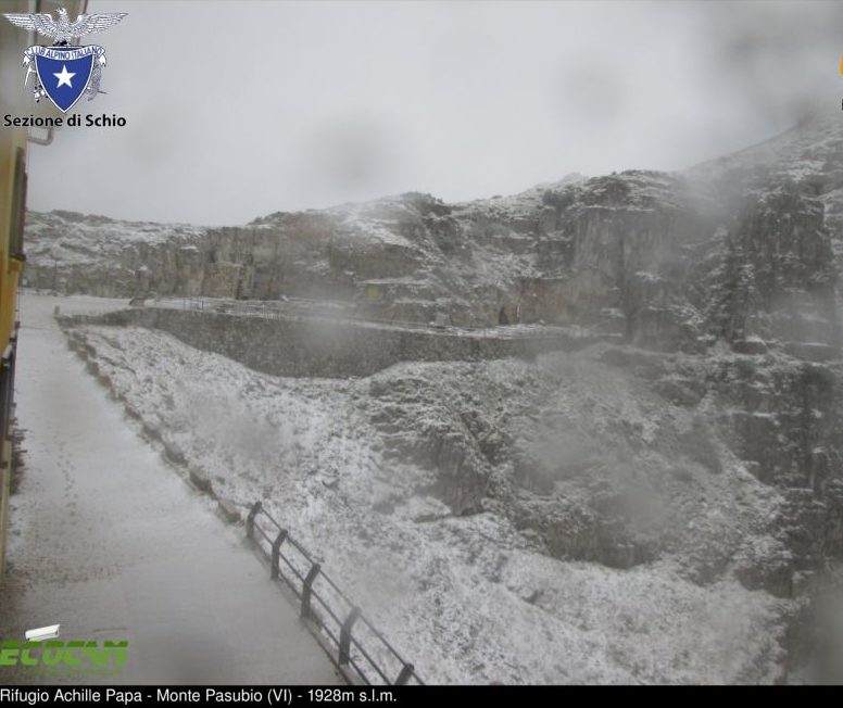 La prima, vera neve sul massiccio del Pasubio. Questa mattina le immagini della webcam del rifugio Papa (1928 metri), trasmesse online dalla sezione del Club Alpino Italiano (Cai) di Schio, hanno mostrato una spolverata bianca sulla vetta tanto amata dagli abitanti dell’Alto Vicentino.
