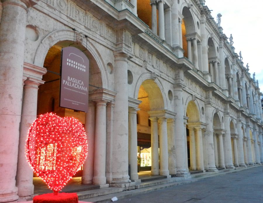 In questi giorni un grande cuore rosso luminoso sta rendendo particolarmente romantica la Basilica Palladiana, che si presta a suggestivi scatti fotografici con protagonisti gli innamorati a passeggio per il centro storico. La decorazione è stata offerta dalla ditta Gasparotto, che ha allestito le luminarie natalizie. Altri cuori, rossi e illuminati, sono stati appesi lungo via Battisti e corso Fogazzaro su iniziativa dell’associazione Vivi Fogazzaro Vicenza.