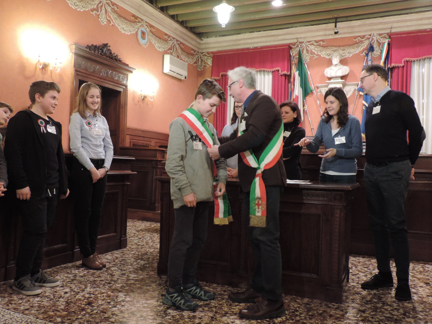 Anche Schio ha il suo baby-sindaco. Si è insediato nei giorni scorsi il consiglio comunale dei ragazzi scledensi, con fascia tricolore in taglia small al primo cittadino “junior” eletto a 12 anni, che frequenta la seconda media e fa parte del plotone degli studenti delle scuole secondarie di primo grado dei tre istituti comprensivi della città. A formare insieme a Edoardo Viero – ecco svelato il nome del sindaco dei ragazzi – una pimpante squadra di “governo” formata da sei assessori e ben diciotto consiglieri.