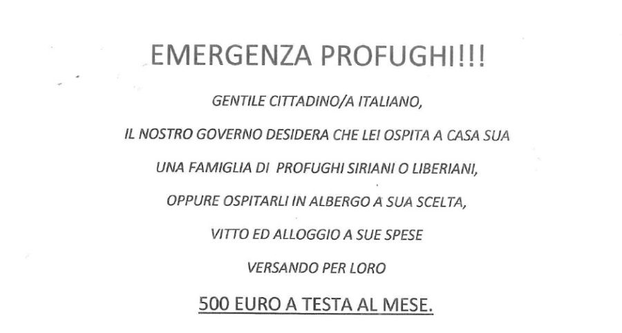 Qualche abitante di Schio stamattina ha trovato una sorpresa nella cassetta della posta: un avviso vagamente minatorio che comunica che per l’emergenza profughi ogni cittadino sarebbe obbligato a ospitarne una famiglia o a provvedere al loro alloggio presso un albergo dietro versamento di una somma di 500 euro al mese. L’avviso prosegue indicando dei numeri di telefono da chiamare per conoscere il numero esatto di profughi assegnati e conclude con un’avvertenza che ha il tono della minaccia: chi non chiamerà i numeri di telefono indicati si vedrà arrivare a casa propria i profughi mandati direttamente dal governo italiano.