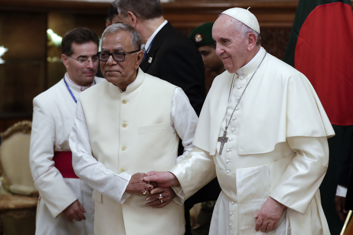 Bangladesh President Abdul Hamid, left, holds hands with Pope Francis as he accompanies at the end of their meeting at the presidential palace, in Dhaka, Bangladesh, on Thursday. The Pope demanded the international community help Bangladesh during the Rohyingya crisis.