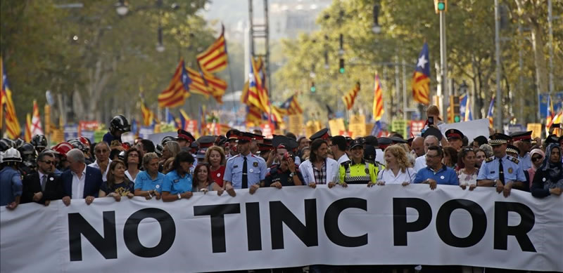 Si è aperta con uno striscione bianco con la scritta “No Tinc Por”, “Non ho paura”, la manifestazione svoltasi ieri a Barcellona in risposta agli attentati. A portare lo striscione 75 rappresentanti dei servizi di sicurezza e di emergenza della città. Una folla enorme, almeno 500mila persone, ha invaso l’immenso viale dei negozi: molte le bandiere dell’indipendenza catalana.