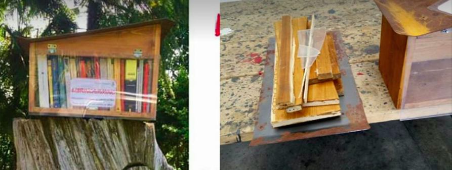 La casetta di Libri in cammino prima e dopo l'atto di vandalismo (foto Facebook Luca Cortese)