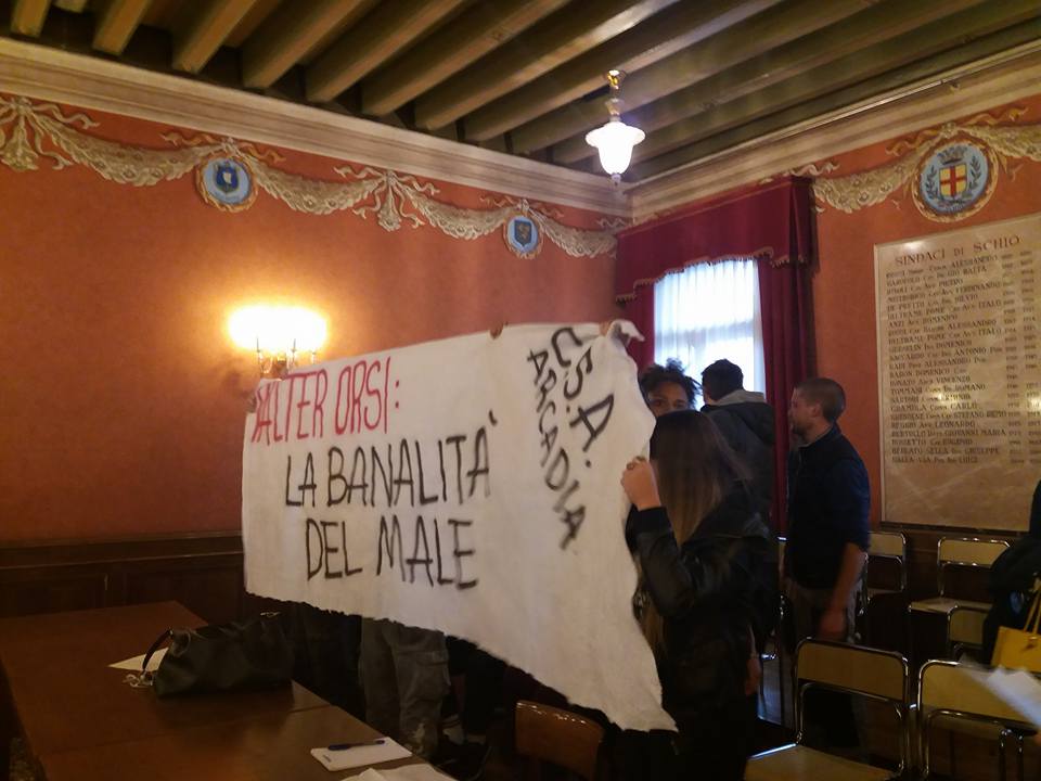 Blitz degli attivisti del Centro Sociale Arcadia in consiglio comunale a Schio, stasera. Un gruppo di giovani è entrato in sala consiliare volantinando e srotolando uno striscione con la scritta “Valter Orsi: la banalità del male”, in risposta alle dichiarazioni del sindaco in cui equipara l’occupazione dei Chiostri per rispondere all’emergenza freddo alla manifestazione di PrimaNoi davanti all’Hotel Eden. I militanti sono poi stati fatti uscire dalla sala dagli agenti della polizia locale.