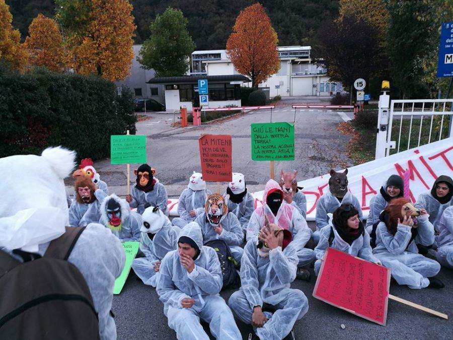 Protesta davanti alla fabbrica chimica Miteni di Trissino: decine di attivisti in tuta bianca, camuffati con maschere di animali, si siedono davanti all’ingresso dell’industria impedendo il transito di uomini e merci, oltre all’accesso dei lavoratori.