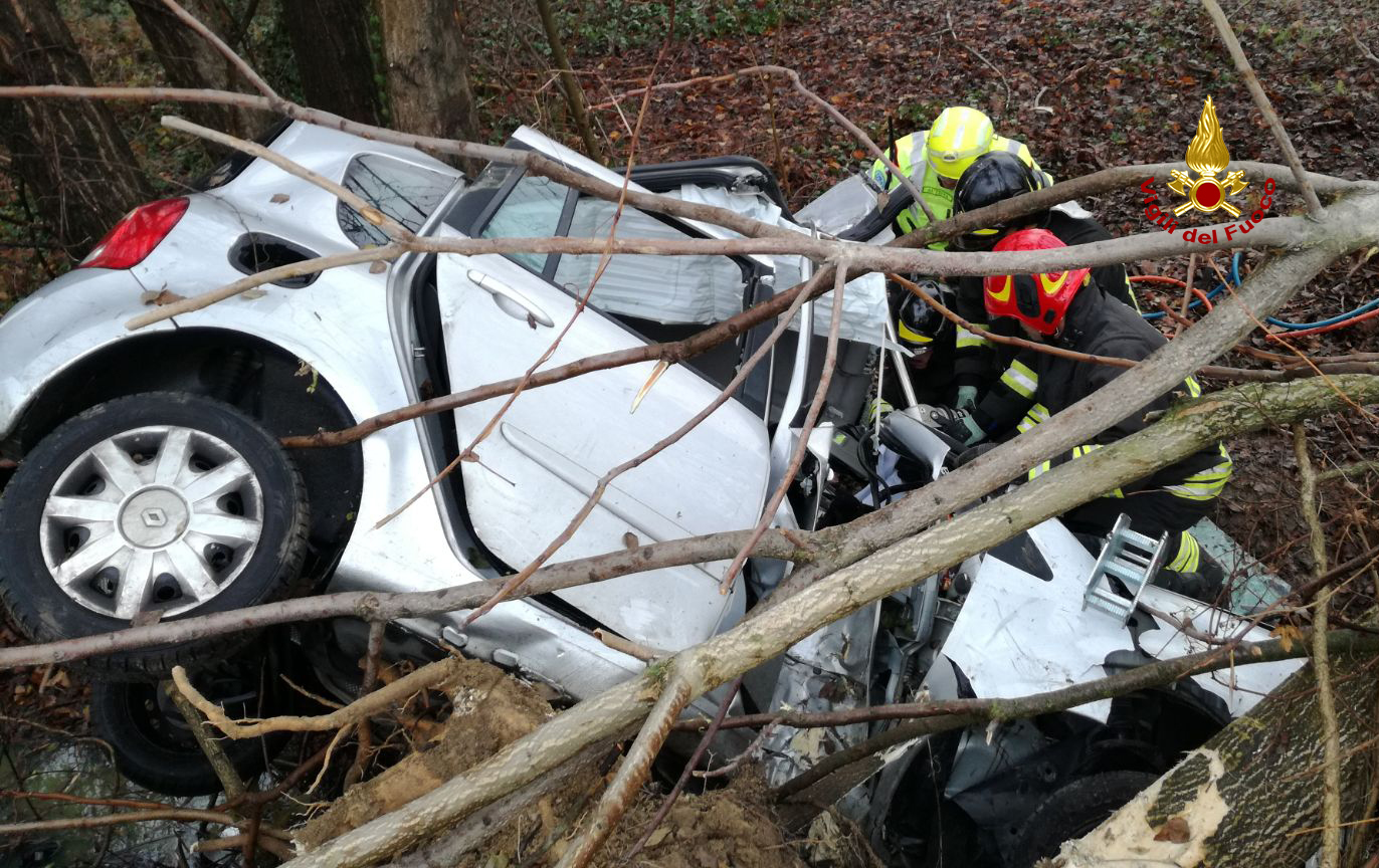 Con l’auto dentro al fosso, i pompieri la liberano dalle lamiere con motoseghe e cesoie