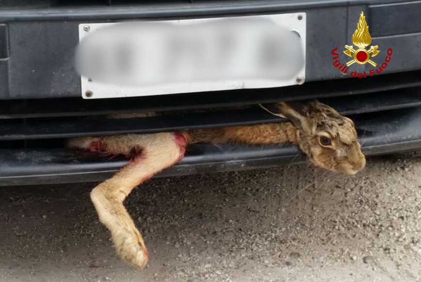 Lepre incastrata nella mascherina paraurti salvata dai vigili del fuoco