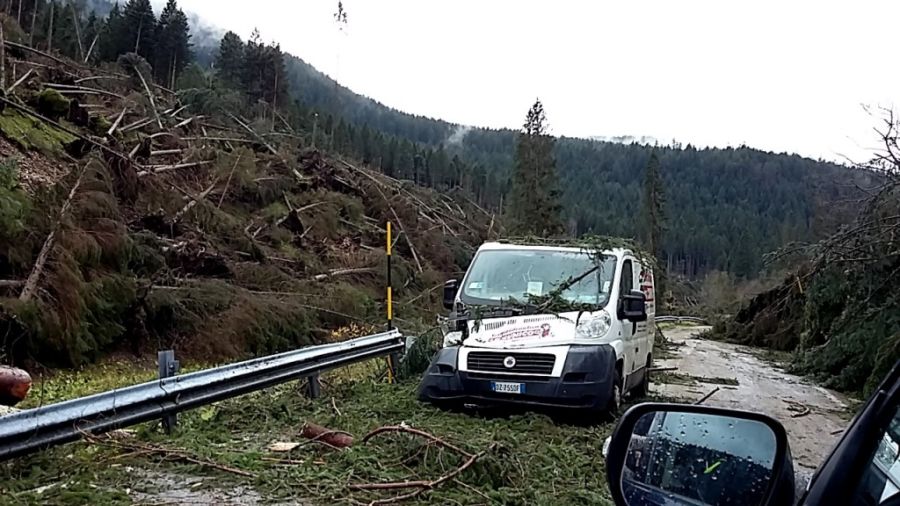 Quando arrivo dove la Strada provinciale 349 è interrotta, poco dopo l’abitato di Camporovere (Roana), un carabiniere forestale mi ferma: impossibile proseguire. Cade una pioggerella leggera e aspetto con pazienza che qualcuno delle forze dell’ordine abbia modo di percorrere la strada chiusa per motivi di servizio, così da avere la possibilità di salire a bordo e transitare con loro in quella che già mi annunciano come una devastazione: in zona Ghertele, a tredici chilometri da qui, sulla strada della Val d’Assa che porta a Lavarone (Trento) sono venuti giù i boschi e c’è mancato poco che qualcuno ci lasciasse la vita.