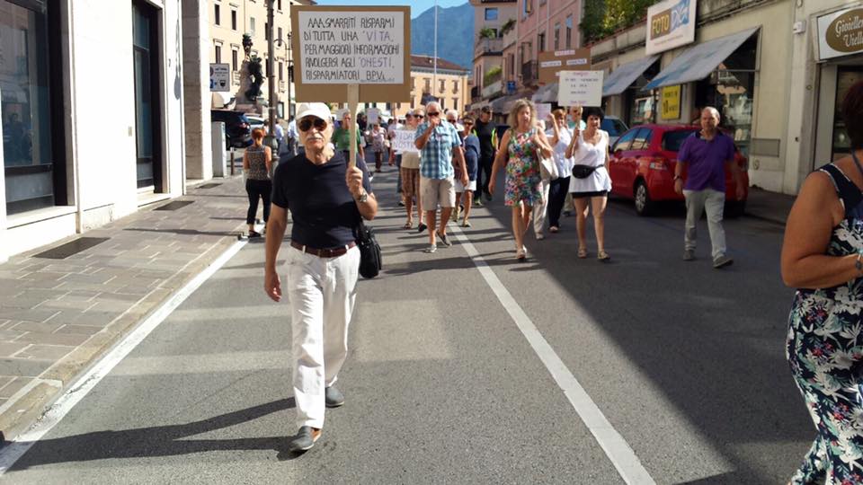 Protesta pacifica e spontanea in strada stamattina a Schio per circa un centinaio di risparmiatori azzerati della Banca Popolare di Vicenza. Si sono dati appuntamento con cartelli davanti alla sede dello sportello della filiale in piazza Garibaldi, bloccandone l’ingresso, e poi si sono spostati in via Marconi davanti alla sede scledense di Veneto Banca. Bloccato anche il traffico. “Abbiamo avuto grande solidarietà da parte degli automobilisti e dei motociclisti che hanno compreso la gravità della situazione” spiega Elena Bertorelli della Casa del Consumatore.