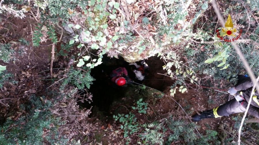 Setter precipita in una buca di 25 metri, salvato dagli speleo-pompieri