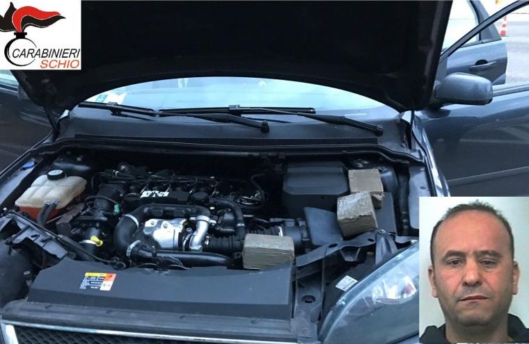 Nel vano motore della Ford Focus dell’uomo, pregiudicato per reati analoghi, i carabinieri hanno trovato e sequestrato tre panetti di hashish, ciascuno di un chilo. Un ulteriore approfondimento investigativo ha permesso di sequestrare a El Mouimi anche 620 euro in contanti, probabile provento dell’attività illecita. L’uomo è stato condotto quindi alla casa circondariale di Vicenza, dove è a disposizione dei magistrati.