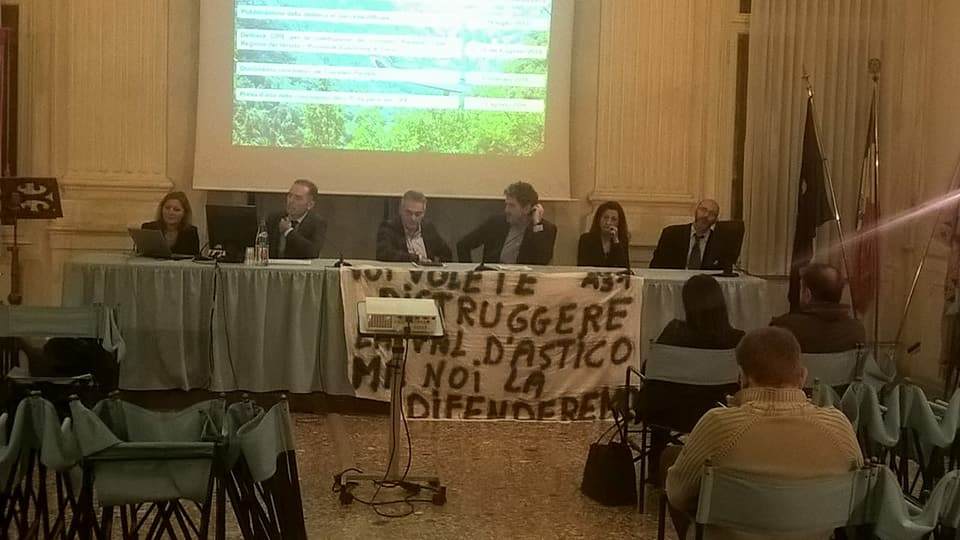 “Una cinquantina di esponenti della Comunità Salviamo la Val d’Astico hanno stasera pacificamente invaso e occupato il salone nobile di villa Cordellina, dove la holding A4 teneva la presentazione, in verità molto poco pubblica, del progetto definitivo della A31 Nord. Una farsa in spregio ai cittadini e alle cittadine che abitano la valle, esclusi da qualsiasi processo partecipativo e consultivo rispetto all’ennesima grande mala opera ispirata da mere ragioni speculative, il rinnovo senza gara della concessione dell’ autostrada Serenissima Bs-Pd. Contestiamo la legittimità dell’ incontro, pubblicizzato solo la mattina stessa dal Giornale di Vicenza, senza informare le amministrazioni dei Comuni interessati e tenuto praticamente nel punto più lontano della provincia dalle zone che subiranno i cantieri, con l’evidente intento di mettersi al riparo dal dissenso dei territori.