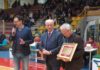 Prima del match il sindaco di Schio Valter Orsi e l’assessore allo Sport Aldo Munarini hanno celebrato la società guidata da trent’anni dal presidente Marcello Cestaro. Dalle mani del primo cittadino Cestaro ha ricevuto una targa per celebrare le 10 Coppe Italia vinte durante la sua gestione.