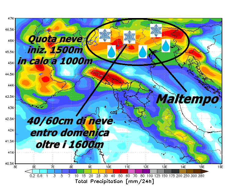 Giornata di maltempo con nuovi impulsi perturbati da ovest. Pioggia moderata in pianura e neve a tratti copiosa in montagna con quota in calo a 1400m. Sono attesi altri 10-25mm di pioggia e 20-30cm di neve oltre i 1600m. Temperature stazionarie. Estremi termici in pianura tra +5 e +9°C.