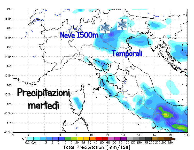 Cielo irregolarmente nuvoloso la mattina. Nel pomeriggio andrà aumentando l’instabilità un po’ su tutta la provincia. Verso sera entrerà da nord aria relativamente più fredda, la quale innescherà la formazione di celle temporalesche, in grado di portare 10-20mm di pioggia su gran parte del territorio e nuovamente la neve fin sui 1500m. Temperature in sensibile calo nella seconda parte della giornata.