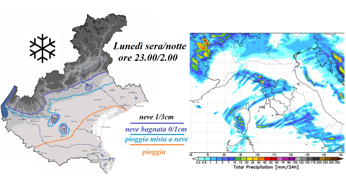 In tarda serata giungerà da ovest un debole passaggio perturbato, e dati i valori termici alle varie quote i fiocchi si spingeranno molto in basso, fin sulle pedemontane o alte pianure.
