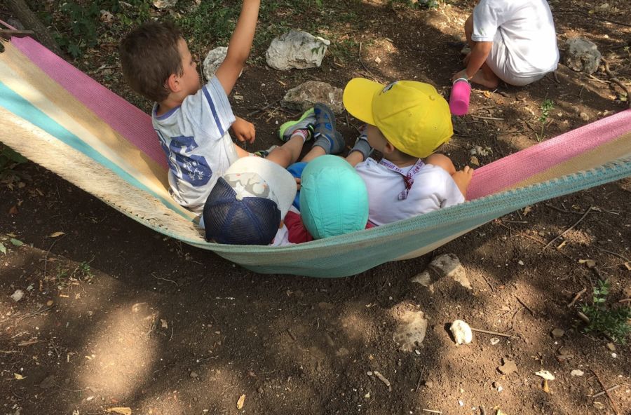 A un certo punto strilla: “Mettiamoci tutti sulla MACACA!”. Lo trovo così: in mutande e scarpe da ginnastica, lui e altri tre nanerottoli nelle stesse condizioni, che si dondolano sull’amaca nel boschetto. Osservo sorridendo la scena per tre-cinque-otto minuti, lui mi ignora anche se mi ha vista benissimo. Ad un certo punto inizio il ben noto balletto di “Dai, ora andiamo” “Un attimo” “Dai, ora andiamo” “Un attimoooo”, ripeti 5 volte aggiungendo “Dai, che a casa ti do il gelato”, senza ottenere il minimo risultato.